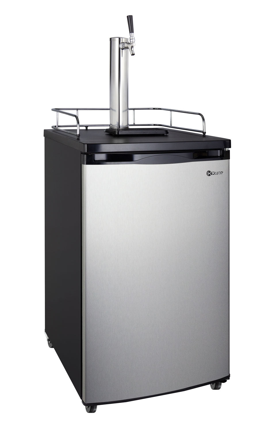 This Kegco K199SS-1NK Single Faucet Full-Size Beer Keg Dispenser stores your kegs in a black cabinet with an elegant stainless steel door, and comes with a single tap beer tower. Two removable wire shelves make it easy to turn this keg fridge into a regular refrigerator or beverage center when you need additional refrigerated storage space for snacks or other beverages. The 2-1/2" casters let you move this kegerator into any room in the house, so you can dispense your favorite cold kegged beer in the kitchen, bar, or dining room. Comes with a Kegco Exclusive tower that measures 14" tall, giving you an extra 2" of space over standard draft beer towers to allow you to easily fill tall growlers and pint glasses.