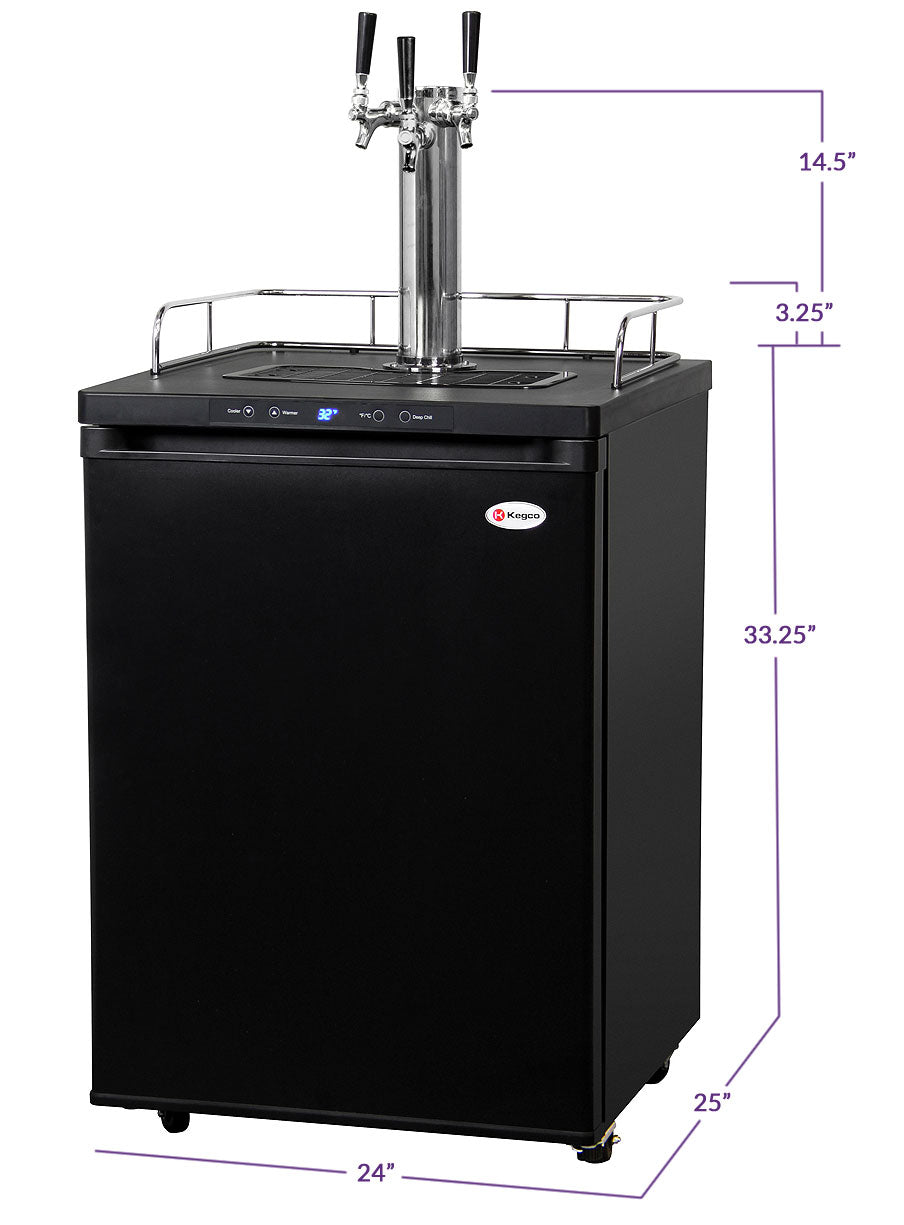 Conveniently hold and dispense up to three homebrew ball lock Cornelius kegs at a time with the Kegco K309B-3NK Three Faucet Digital Keg Dispenser. This keg beer dispenser has been designed for freestanding applications and features a matte black cabinet and door that can blend into any decor. Like our other high-quality Kegco Beer Dispensers, the K309B-3NK includes features like attractive styling, a removable and easy-to-clean built-in drip tray, a chrome guardrail that prevents glasses from sliding off the top, easy rolling casters, and a 3-tap draft tower. In addition to those features that you've come to love, the K309B-3NK has digital temperature controls that give you the ability to see your specific temperature setting and easily set it with the push of a button, and boasts a wider available temperature range for more precise temperature control. Comes with a Kegco Exclusive tower that measures 14" tall, giving you an extra 2" of space over standard draft beer towers to allow you to easily fill tall growlers and pint glasses. Comes with a Kegco Exclusive tower that measures 14" tall, giving you an extra 2" of space over standard draft beer towers to allow you to easily fill tall growlers and pint glasses.