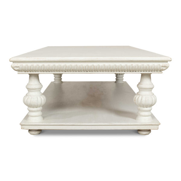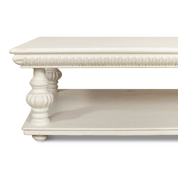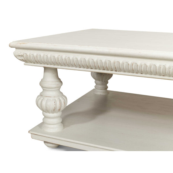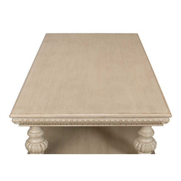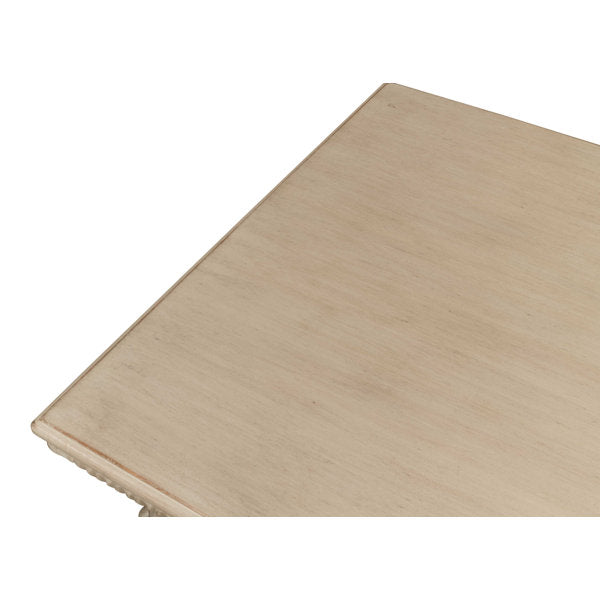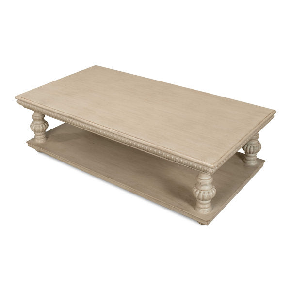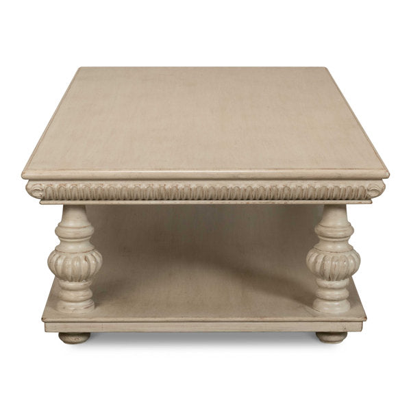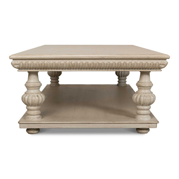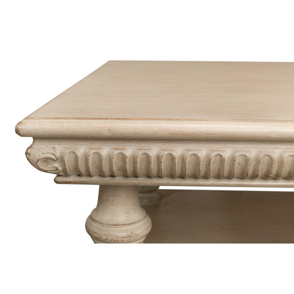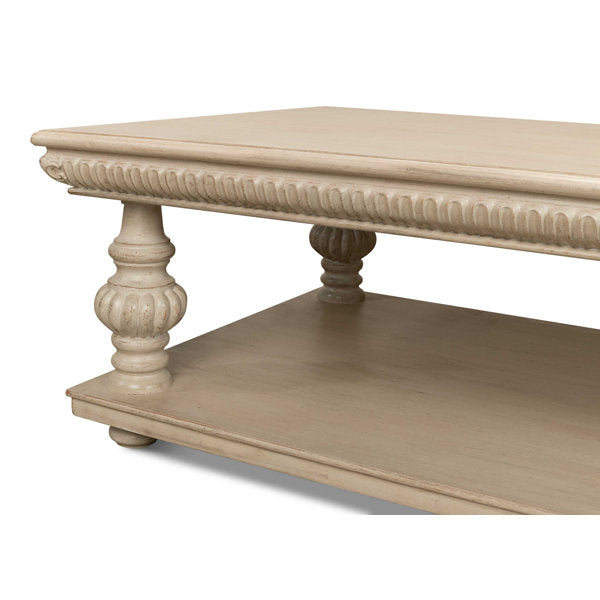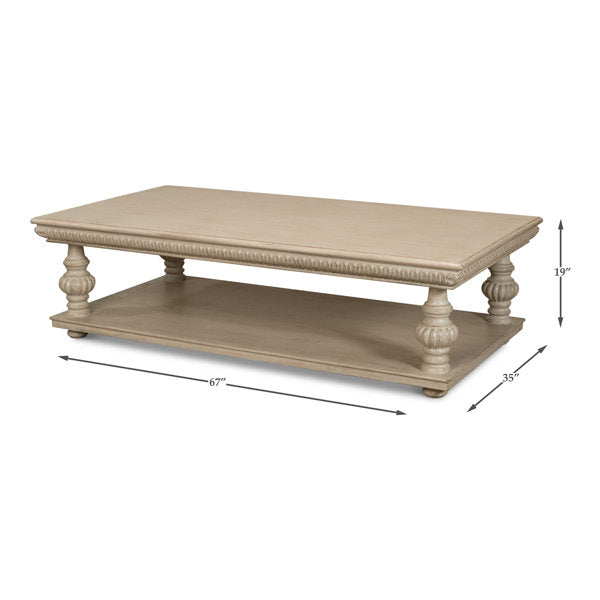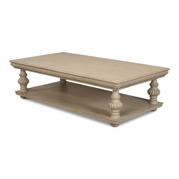 Dramatic enough on its own to carry an entire room, this transitional pine cocktail table is one of a trio of pieces that make up a true statement collection. Rich in carved details, grand in scale, and finished in stone gray with a natural top" it solos with aplomb or performs with the collection"s other occasional players in perfect harmony.