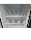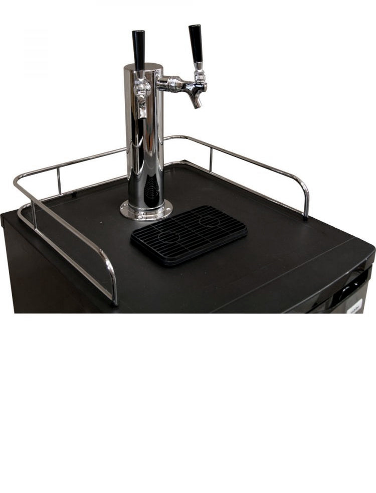 This Iced Coffee Kegerator includes a dual faucet draft tower with stainless steel faucets and fittings, two sets of ball lock keg couplers for Cornelius home brew kegs, a double gauge nitrogen regulator, and a 15 cu.ft. nitrogen tank. The interior of the cabinet is large enough to hold up to two corny kegs at a time. Additional features include rolling casters which allow you to easily move the unit, a chrome guard rail that prevents glasses from sliding off the worktop and a built-in drip tray for easy cleanup. The nitrogen tank can easily fit inside the fridge, but it includes an external tank mount and a knockout for the air line if you'd like to manage the tank outside the fridge and have more room inside. What's more, this iced coffee keg dispenser converts to a refrigerator with two adjustable wire shelves so you can use it for extra storage when it's not storing cold brew coffee kegs.