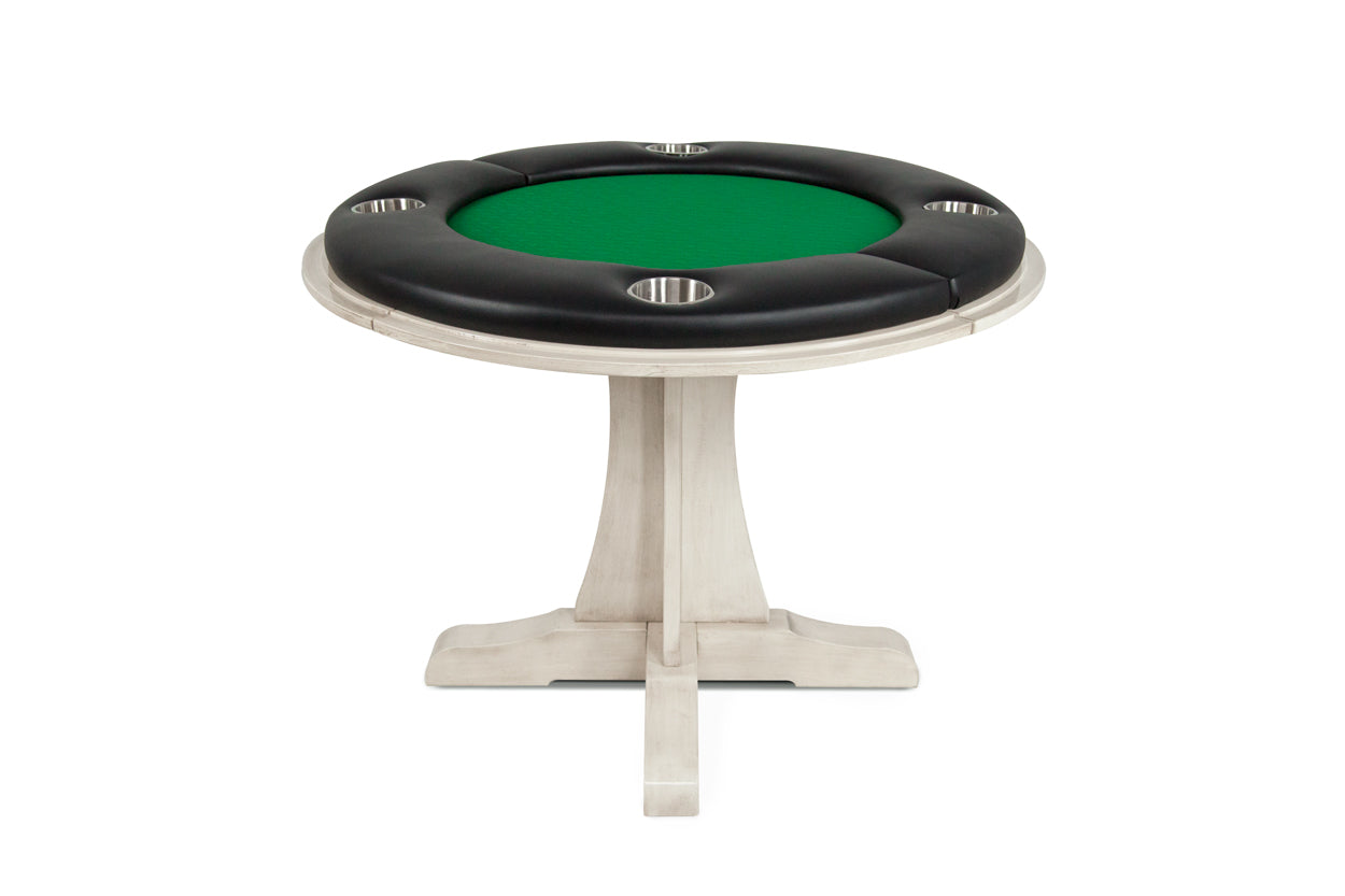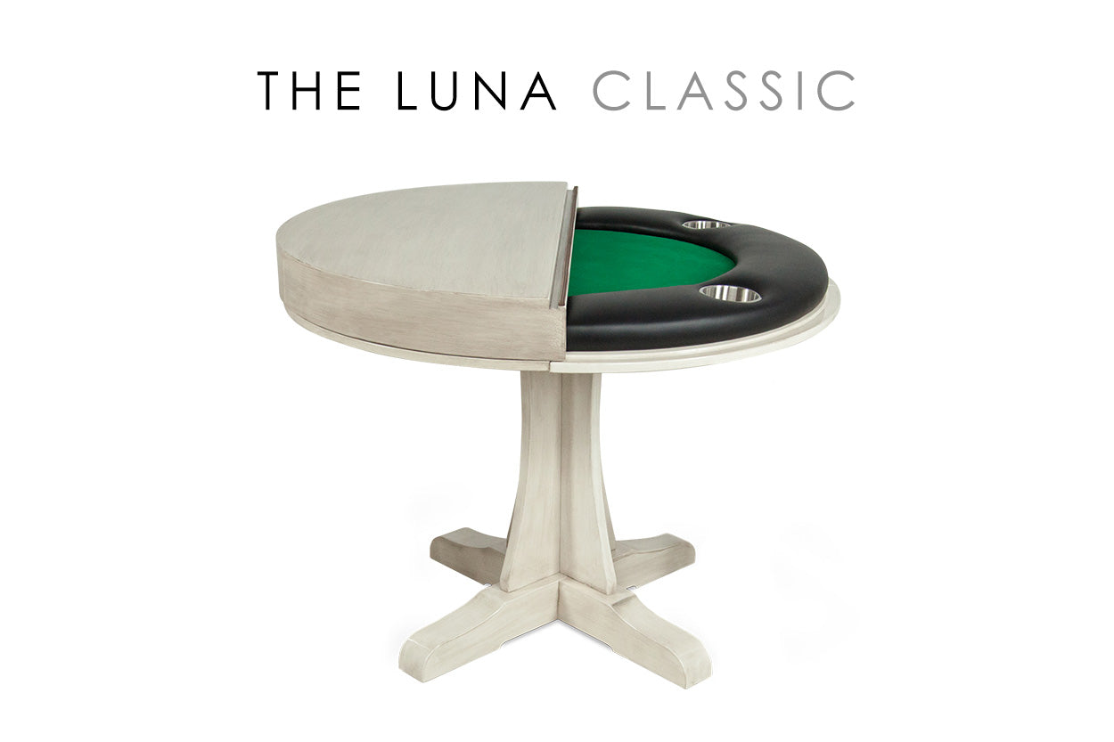Introducing the Luna, a compact game table that moonlights as a dining table! Decorating a compact, urban space shouldn’t be rocket science. The Luna game table is a stylish solution to your decorating dilemma. The Luna features a thoroughly modern gray wash that is every bit as urban chic as you are. Ideal for four players, the Luna sports a 6” wide armrest that is upholstered in premium faux leather for maximum comfort while playing and features four 4-inch stainless steel cup-holders for convenient beverage storage. The Luna can be purchased with matching dining chairs and a matching round dining top that comes in half for effortless assembly.