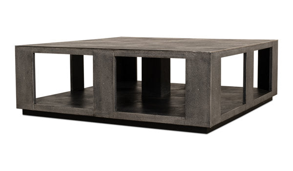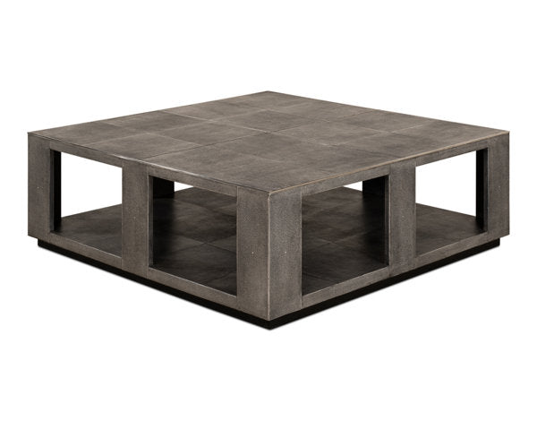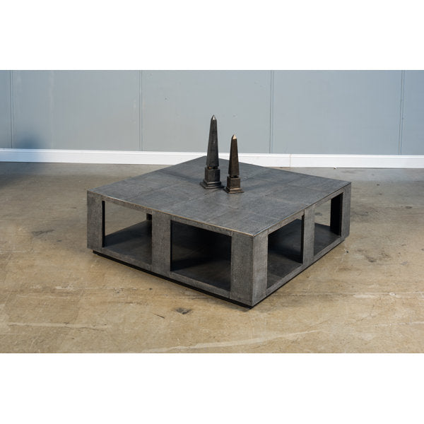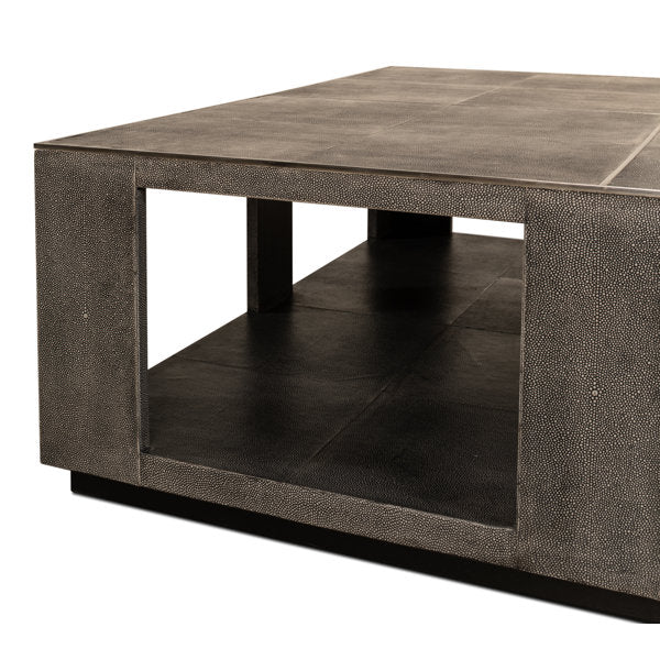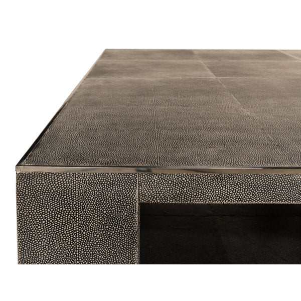 A sizable coffee table with subtle stainless steel accents. Shagreen leather. Notice that the small platform base is slightly recessed. Display space on the bottom shelf.
