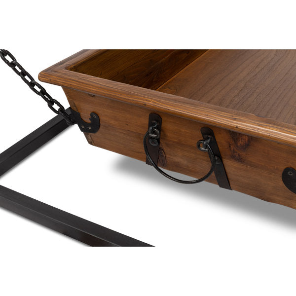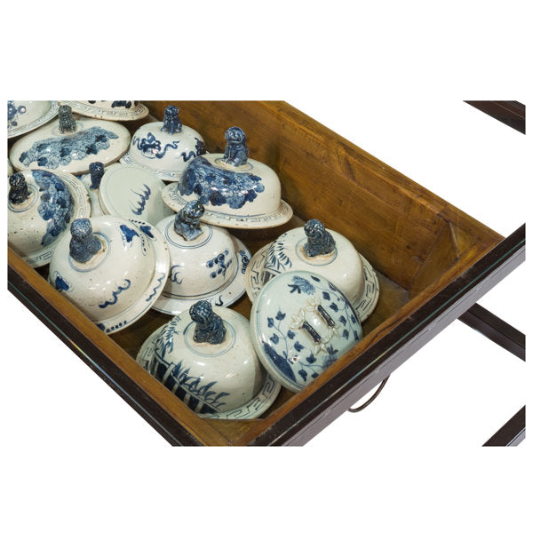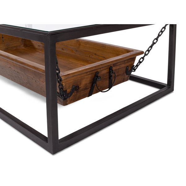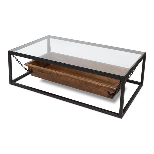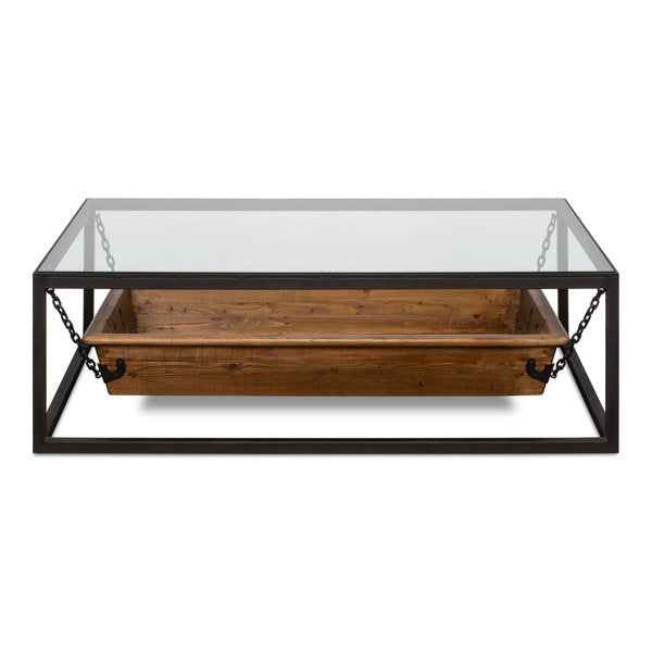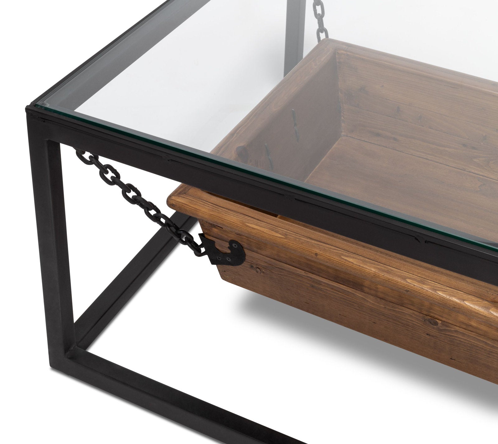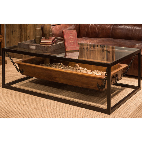 Here are industrial-strength looks and creative inspiration. A substantial metal base supports an antique trough. Who knows what you may decide to display under the clear glass top!
