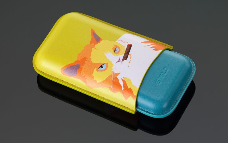 In contrasting bright colors and contemporary design, this grumpy cat will definitely catch one's eye. Open the cigar case, and you will find "scratches" there ! Made of quality cowhide leather and designed to fit 3 sticks of 56 ring gauge cigars, this cigar case is your perfect companion for a night-out. Two colors are available: Blue/ Red and Yellow/ Green. Humidor, ashtray, cigar case and lighter, cutter set are available in the same design. Get all of them to complete your collection. You may not be a cat-lover, but you must love this grumpy cat series at first sight.