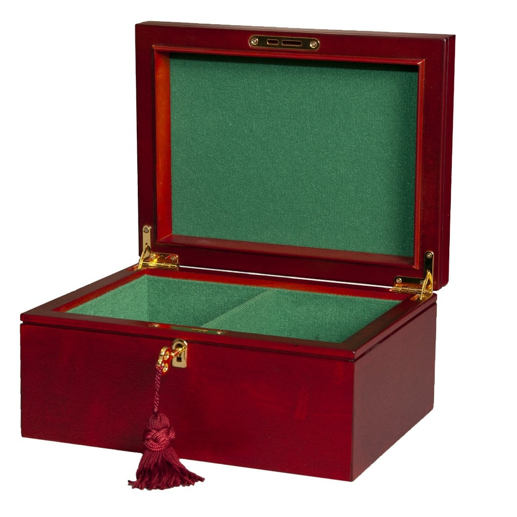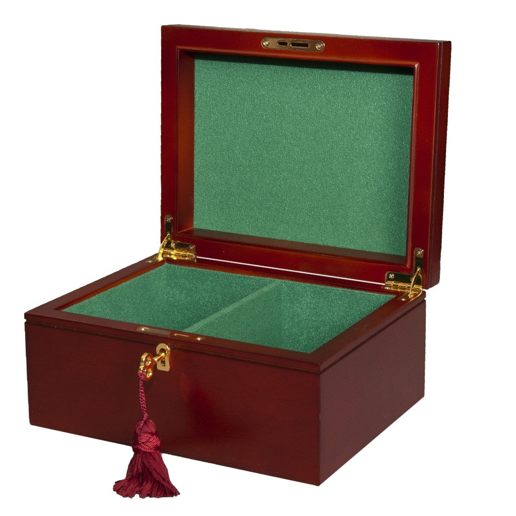 The Premium Chess Box is lined in green billiard cloth, divided and features brass quadrant hinges and a lock & key.