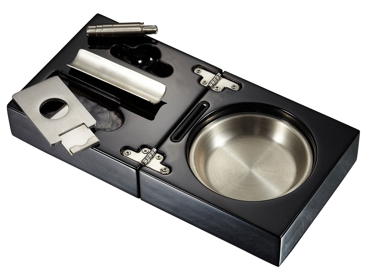 Visol Bremen Black Lacquer Folding Cigar Ashtray with Cutter and Punch
