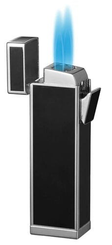 This luxury cigar lighter is sure to be a hit with your friends. The smooth black and silver finish accentuiates its slim design and the easy to use activator means that whenever and wherever it is time to enjoy your favorite cigars, you can be sure the double torch flames will get the job done every time. Black Lacquer Finish with Chrome Details Single Action Ignition Approximate Dimensions: : 3.2 inches by 0.8 inches by 0.5 inches; Approximate Weight: 0.2 lbs. Flame Height Adjustment Wheel and Butane Refill Nozzle located at base of Lighter Comes Packaged in Cardboard Box; Can be Easily Gift wrapped