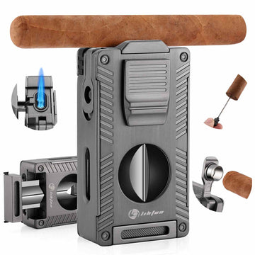 All-in-One Cigar Lighter : This premium cigar lighter utilizes innovative technology to seamlessly combine all the necessary cigar accessories. It boasts butane ignition, integrated cigar stand, cigar punch, cigar cutter v cut, and cigar draw enhancer. Just bring this all-in-one versatile cigar lighter when you go out to enjoy your cigars. Its pocket-friendly size ensures easy portability, fitting perfectly into your travel cigar case, so you can enjoy your cigars swiftly and hassle-free, wherever you go.